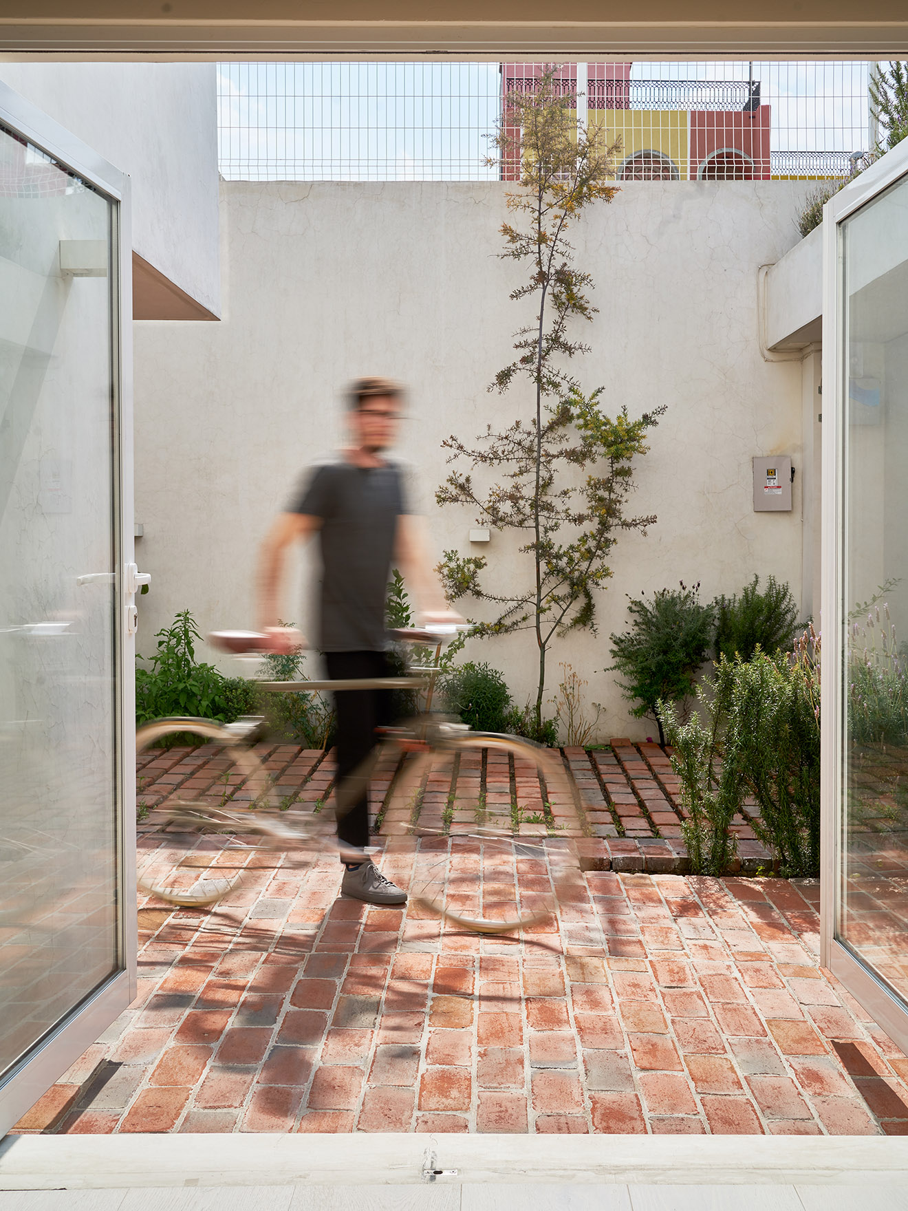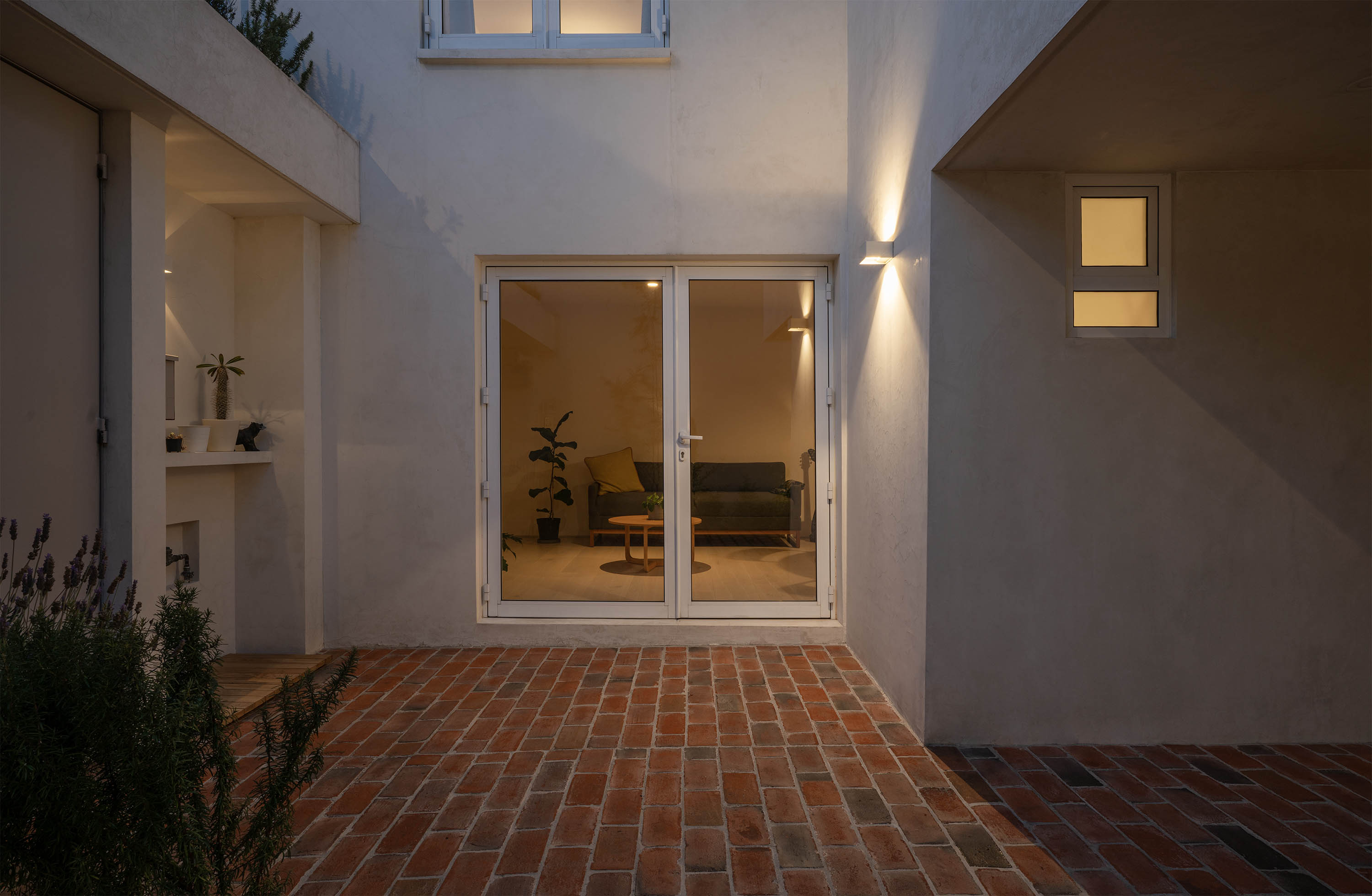 Most of the original structure was kept intact, focusing on the possibilities of the existing shape of the house. New windows were opened to the south to provide light to key areas, while a double brick wall was built on the façade to enhance sound insulation and thermal properties.