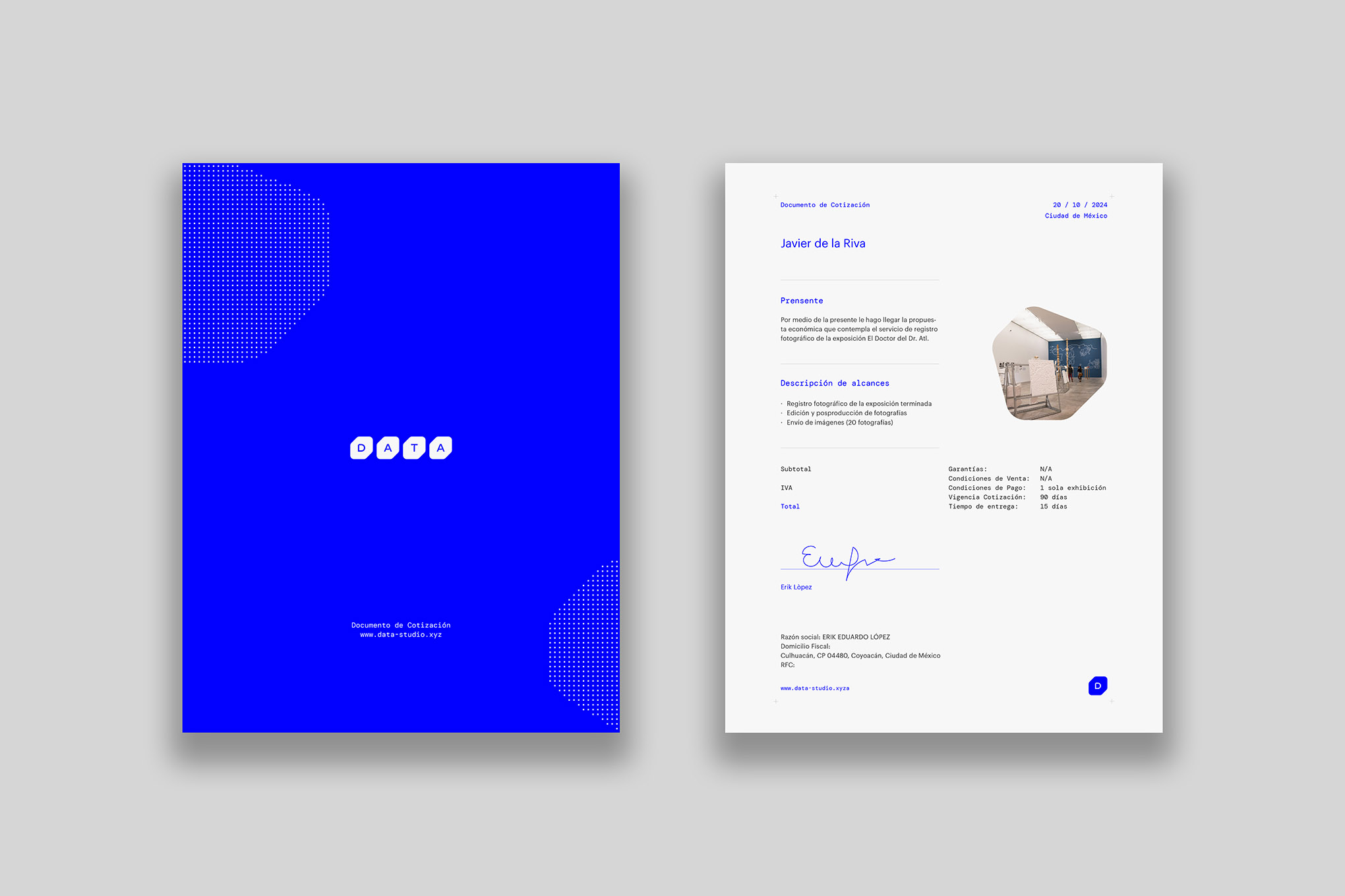 Data is a studio specializing in exhibit documentation photography, led by Erik López. Initially, Erik worked independently but soon expanded into a small team. This growth created the need to update their identity to reflect a more studio-oriented appearance. We used this as a starting point to develop a new identity that represents their current level of experience. While some elements of the previous identity were retained, many aspects were created from scratch, including the studio’s name.